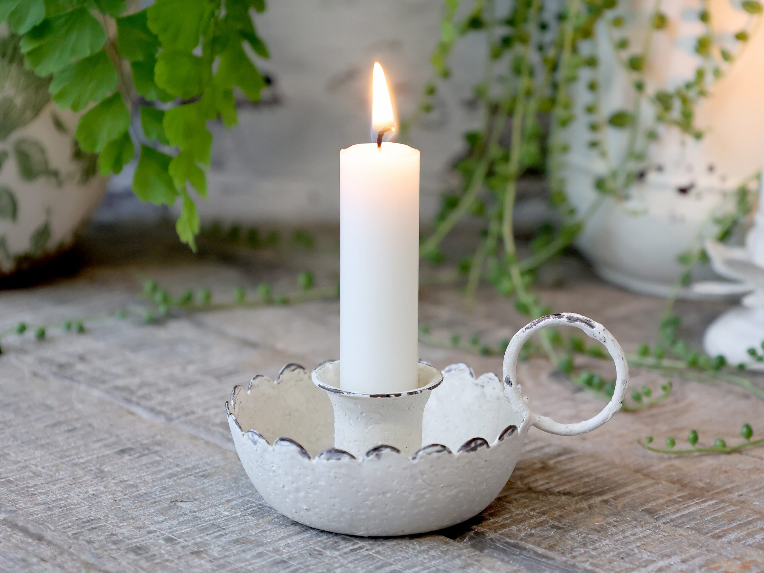 99,00 kr inkl. moms Lägg till i varukorgKammarljusstake med handtag. Passar för ett kronljus. Storlek (Ø x H): 9,5 x 6,5 cm Färg: Antik vit – shabby chic Material: Järn