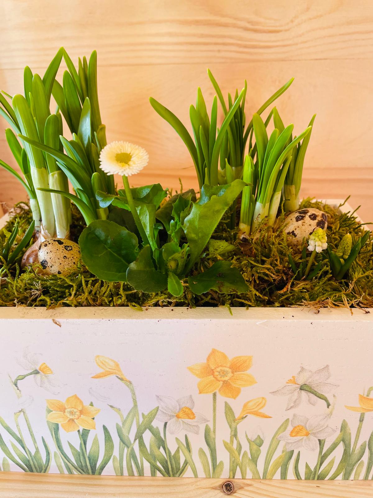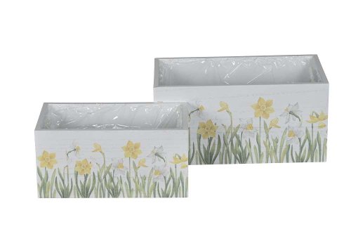 Dekorativ blomlåda i trä med ett vackert motiv av påskliljor som skapar en härlig vårstämning. Lådan passar perfekt för plantering av blommor, örter eller som en fin dekoration på bordet eller fönsterbrädan. Insidan är klädd med plast som skyddar träet och gör den praktisk för plantering.