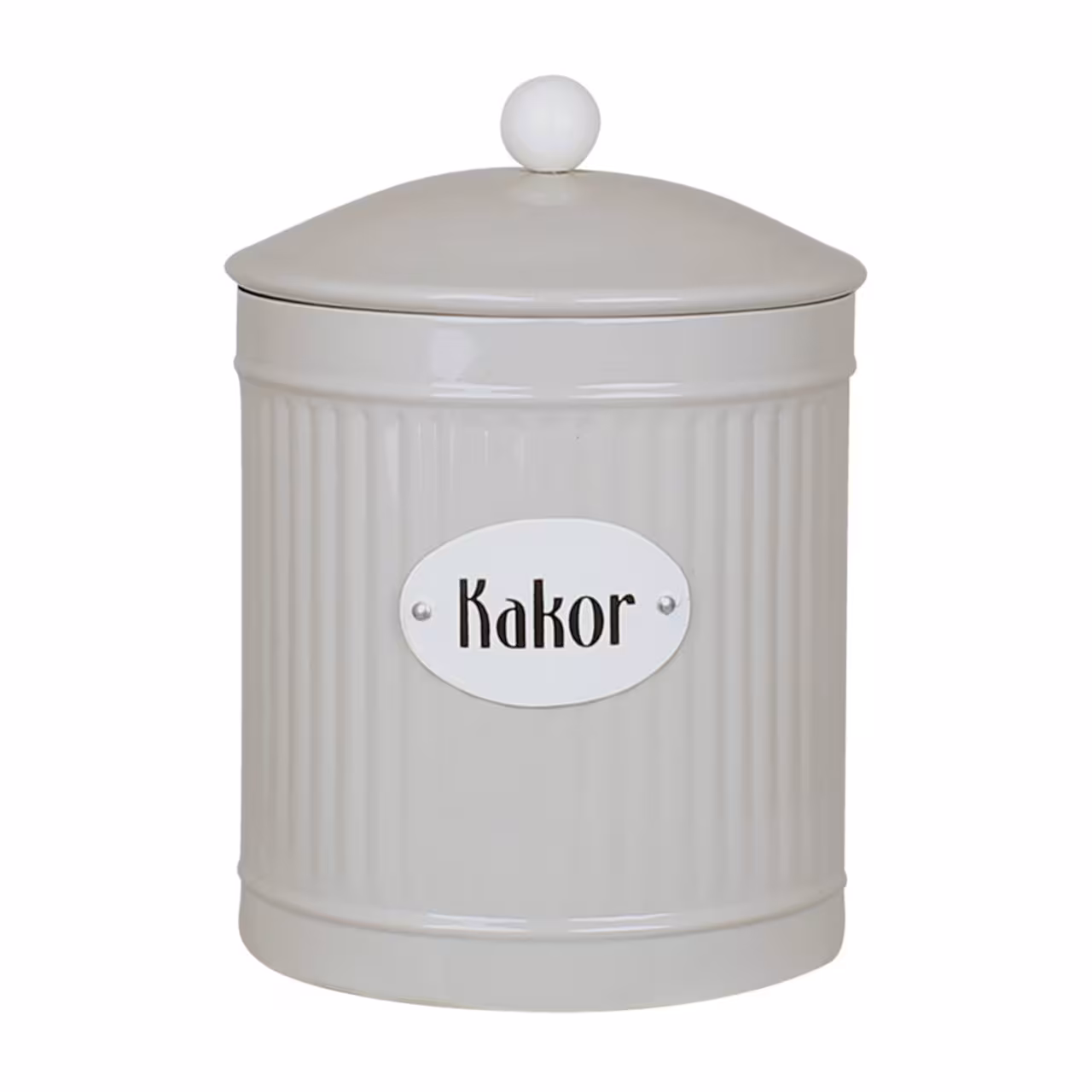 Rund plåtburk med lock med texten Kakor. Från plåtburksserien Hugo Beige.